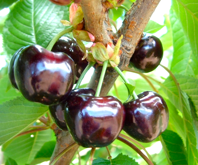 🍒 Owoce: duże, sercowate, o bardzo ciemnej – bordowej, często niemal czarnej skórce ✨. Miąższ intensywnie czerwony, jędrny, soczysty i słodki . Owoce łatwo oddzielają się od pestki. Najlepsze do jedzenia na świeżo, ale świetnie nadają się również do deserów i domowych przetworów.
