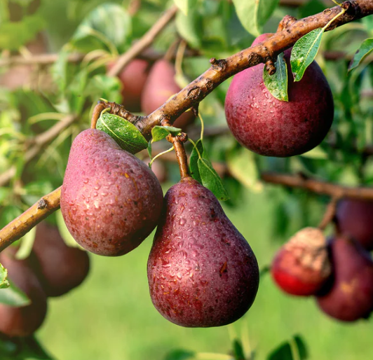 Gruszki są duże (160–200 g), regularne i efektowne. Skórka ma ciemnoczerwony, często bordowy kolor z fioletowym nalotem. Dojrzewanie jest nierównomierne, dlatego zbiór zwykle wykonuje się kilkukrotnie. Miąższ soczysty, deserowy – świetny na świeżo, do kompotów i suszenia. Po zbiorze owoce można przechowywać ok. 2 tygodni.