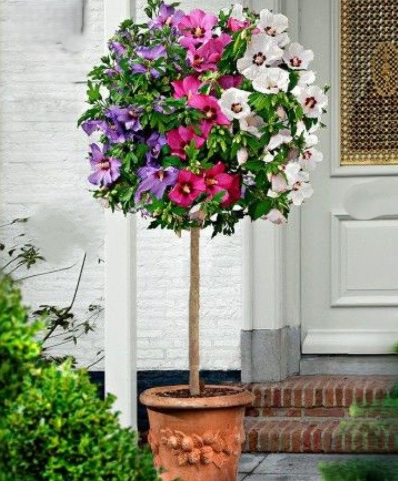 Oferujemy wyjątkowy hibiskus tricolor szczepiony na pniu, który zachwyca kwitnieniem w trzech kolorach kwiatów. Na jednej roślinie pojawiają się kwiaty w odcieniach bieli, różu oraz fioletu, co daje niezwykle dekoracyjny i rzadko spotykany efekt 🌸🌺🌸