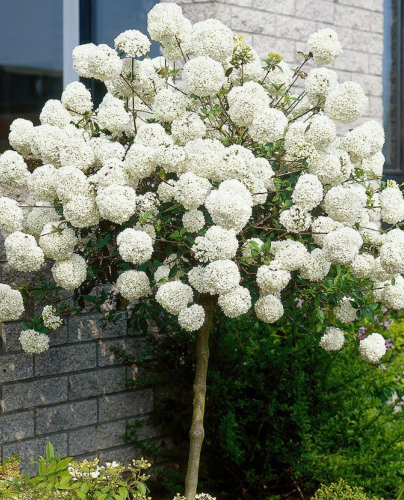 Kalina ‘Eskimo’ to wyjątkowo dekoracyjny krzew liściasty w formie drzewka, szczepiony na pniu. Tworzy gęstą, zwartą koronę i dorasta do ok. 1,5–2 m wysokości, dzięki czemu świetnie prezentuje się nawet w mniejszych ogrodach. Jej największą ozdobą są duże, kuliste, śnieżnobiałe kwiatostany, które pojawiają się od kwietnia do maja i pięknie kontrastują z ciemnozielonymi, błyszczącymi liśćmi. Roślina zachowuje atrakcyjny wygląd przez cały sezon 🌿